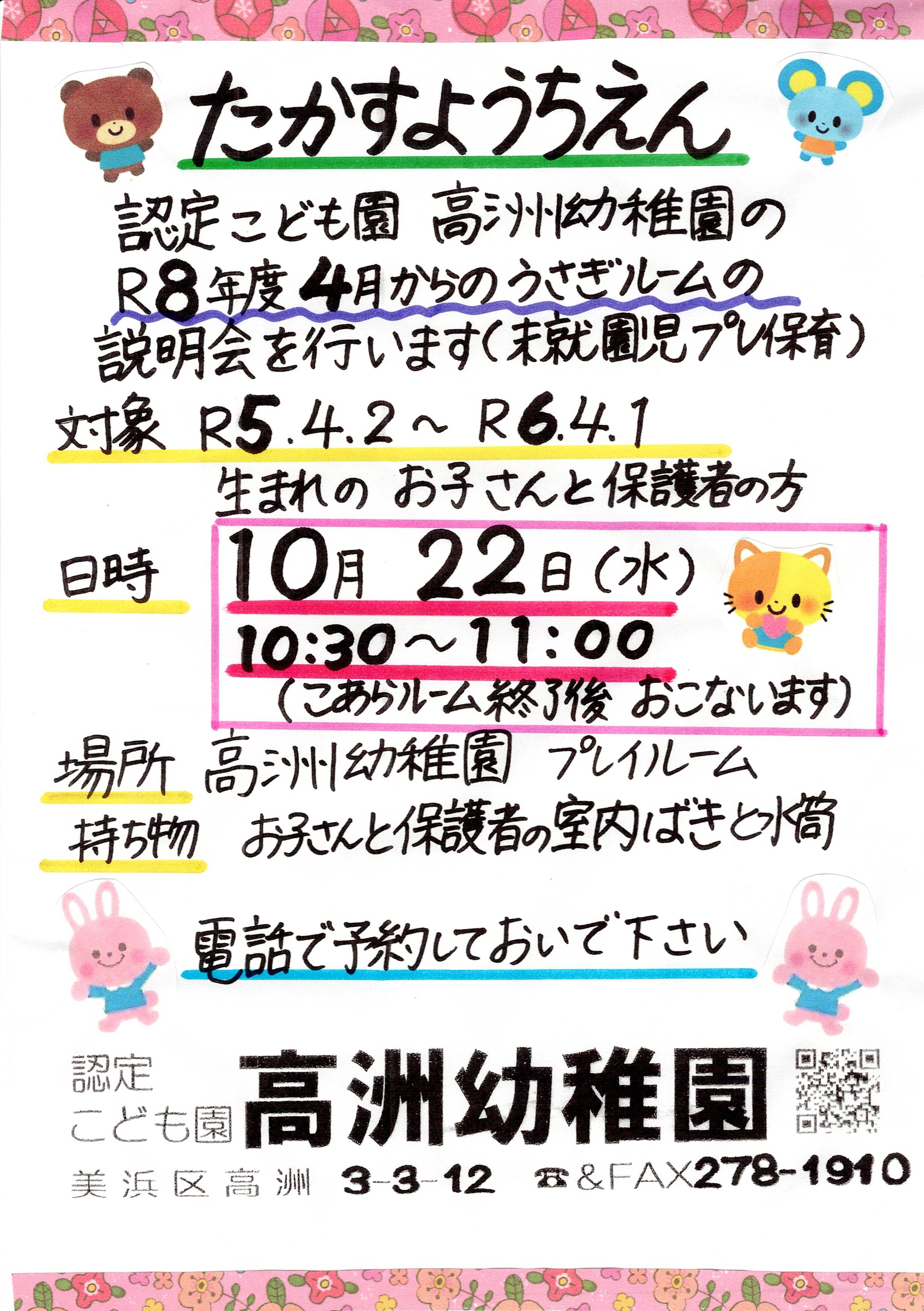うさぎルームは未就園児の2歳児クラスです ちょっぴり早い幼稚園生活を先生・おともだちと楽しみましょう♪ 対 象:R4.4.2〜R5.4.1生まれのお子さん 場 所:高洲幼稚園 保育室 日 時:月・木コースと火・金コース 時 間:9:10〜(保育時間は徐々に長くなります) 若干名募集中 お問い合わせ:高洲幼稚園 043−278−1910 ※うさぎルームの体験募集しています♪ ぜひ遊びにいらしてください くわしくはうさぎルームへ 日 時:令和7年4月25日(金)9:10〜 場 所:高洲幼稚園 保育室 持ち物:親子の室内用の靴(上履き・スリッパ等)・水筒 お待たせしました!うさぎルームがはじまります! うさぎルームのおともだち・先生とたくさん遊びましょうね 今後の予定、持ち物等について詳しいお話しを当日致します 満3歳児クラスの説明会を行います 対 象:R5.4.2〜R6.4.1生まれのお子さんと保護者 場 所:高洲幼稚園 プレイルーム 日 時:令和7年10月22日(水)10:30〜 持ち物:親子の室内用の靴(上履き・スリッパ等) 事前に電話で予約をしてお越しください 高洲幼稚園 043−278−1910 ![]() ![]() |