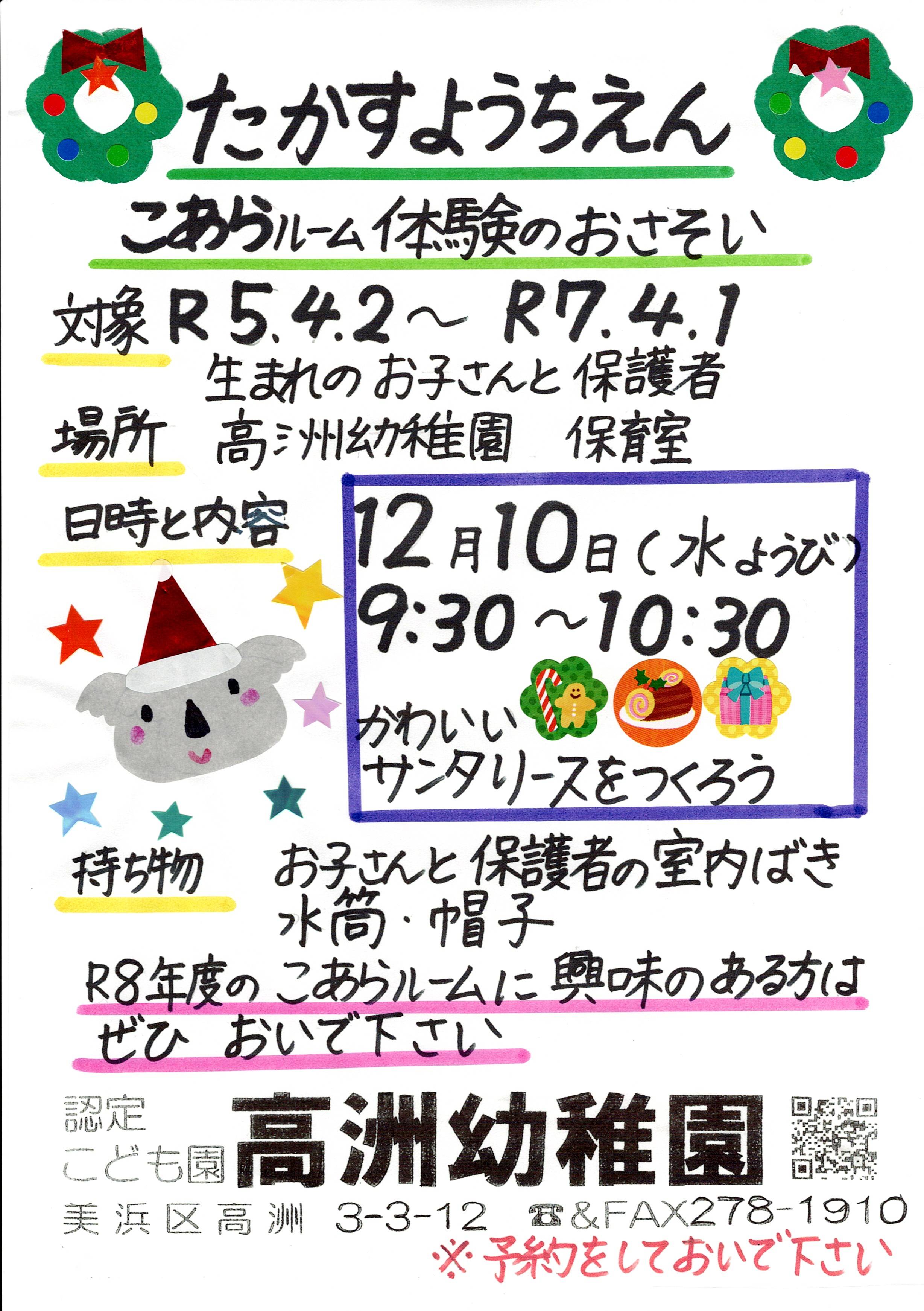 こあらルームのお知らせ![]() 場 所:高洲幼稚園 プレイルーム 持ち物:親子の室内用の靴(上履き・スリッパ等)・水筒・帽子 令和7年9月10日(水)・10月22日(水)・ 11月19日(水)・12月10日(水) ※11月12日を予定していましが公開保育で休園の為変更しました 令和8年1月21日(水)・2月4日(水)・3月4日(水) ♪先生・お友達とたくさん遊びましょうね♪ 対象児:R6.4.2〜R7.4.1生まれのお子さんと保護者 場 所:高洲幼稚園 保育室 日 時:令和7年12月10日(水)9:30〜10:30 内 容:かわいいサンタリースを作ろう! 持ち物:親子の室内用の靴(上履き・スリッパ等)・水筒・帽子 ※お電話での予約をお待ちしています。 高洲幼稚園 043−278−1910 ![]() こあらルームは、お母さんと0・1歳児のちいさなお子さんが、 安心してのんびり遊べる場を提供するクラスです。親子の ふれあいを通して、少しでも子育ての輪を広げる事が出来る ようにとの願いを込めて今年度も実施します。 対象児:R6.4.2〜R7.4.1生まれのお子さんとおかあさん 場 所:高洲幼稚園 プレイルーム(2階) (みどりのアーチ門からお入りください。階段を上がって2階のプレイルーム) 主な内容:親子ふれあい遊び・手あそび・体操・絵本・紙芝居等 (月末に誕生会をします) 参加費:無料 (但し入会金として2,000円頂きます) その他「名札代」170円※制作費・保険代・お誕生カード代等 日 程:水曜日 9:30〜11:00 月1、2回 (10:30〜11:00は自由参加です) 祝祭日、園行事等により、日程が変更になる事もあります。 申込日:令和7年12月10日(水)11:00〜 高洲幼稚園事務室にて受付ます ![]() |